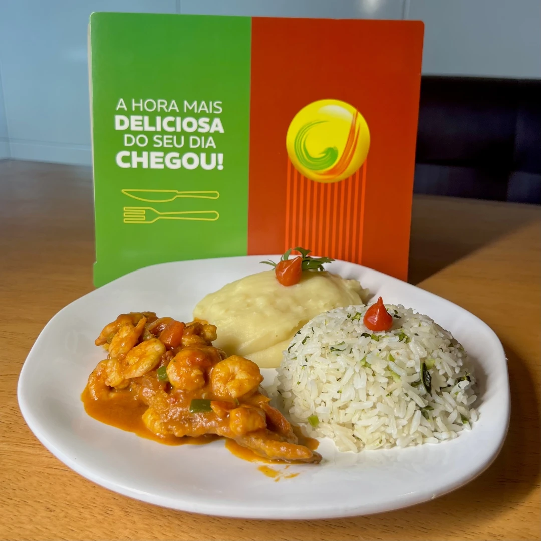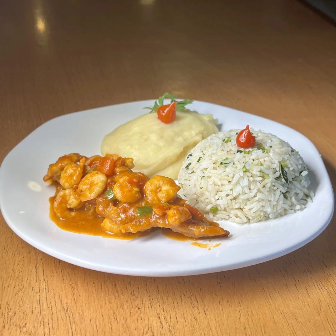 Filé de peixe macio, preparado no ponto certo e coberto com molho de camarão, cheio de sabor e leveza. Você escolhe dois acompanhamentos para completar o prato. Valor da embalagem inclusa.