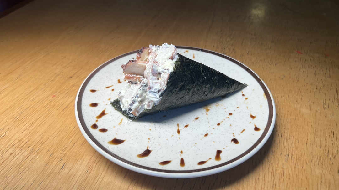Enrolado em cone com recheio de Polvo e cream cheese. VALORES COM A EMBALAGEM INCLUSA!!